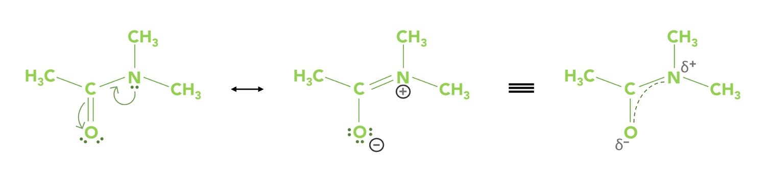 Scheme 2. Resonance structures of DMA, the hybridization results in the delocalization of electrons (indicated by the dotted line) between the O–C–N bonds.